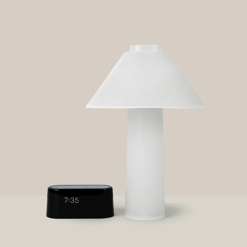 Created to seamlessly fit into any style with clean curves, soft lines, gentle glows, and even padded bottoms so both Clock and Lamp silently rest on any surface.